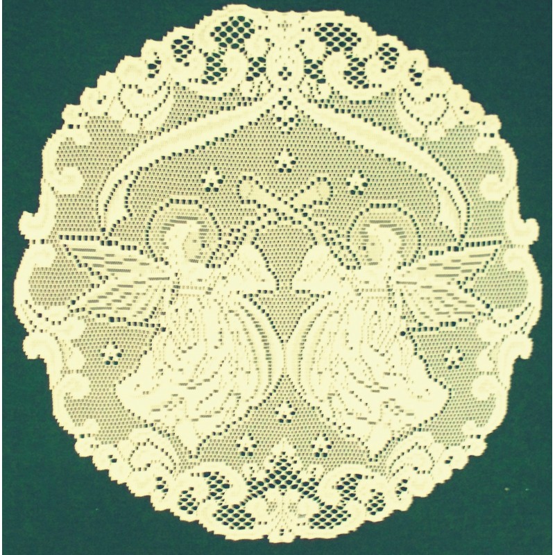 Angels from on high blowing their trumpets, perhaps announcing the birth of Jesus adorn this doily with lovely scalloped edges. Place this over a colored fabric to really make this doily pop. Nice size for displaying those Christmas figurines.